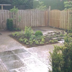 Beplanting zit erin met tijdelijk een schutting voor de privacy. Met de verbouwing van de garage later komt er een combinatie van steen en hout als afscheiding. Nu eerst genieten van een ruimere tuin en meer plek om samen met vrienden te bbqen.